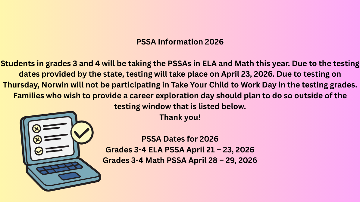 Please be sure to check the Norwin School District webpage (click on the heading above), KDKA, WPXI, or WTAE webpages for all delays and flexible instruction days. In the event of a 2-hour delay, school will begin at 11 AM. Breakfast will not be served when there is a 2-hour delay. The AM/PM Kindergarten schedule will be as follows: AM students will report at 11 AM and be dismissed at 12:55 PM. PM students will report at 1:35 PM and be dismissed at the regular scheduled dismissal time of 3:30 PM.